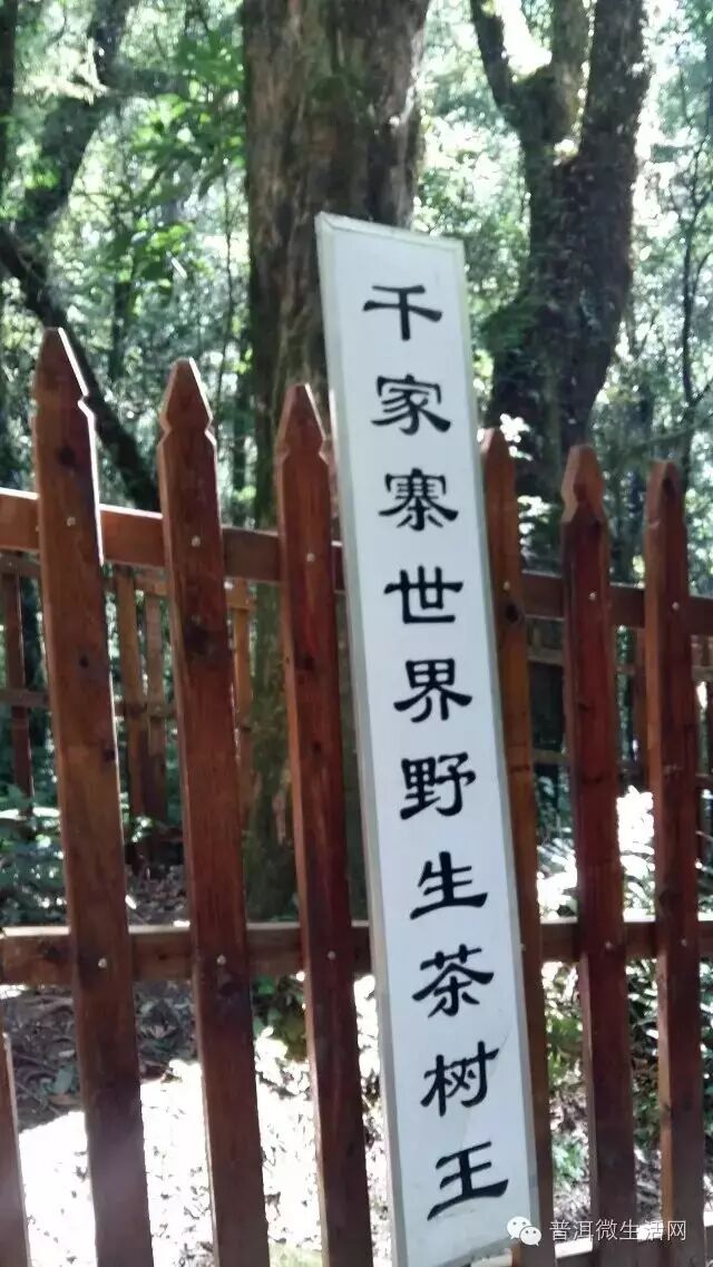 既然老茶樹腰間的標牌被世人標注著“一號”,那么自然還有二號、三號.....?是的,就在老茶樹身畔不遠處,我們來到坡頂柵欄入口處,就發現一棵標注“三號”的古茶樹。我們一路攀爬于千家寨這片早已被保護起來的原始叢林里,在山腰上發現有很多同樣在腰間別有數字編號標注牌的老樹,我分別看見了98、99等序號的標注,這些被標注編號的老茶樹,壽齡均達到了兩千年左右。經了解,除了一百多棵有編號標注身份的、被世人勘察鑒別達兩千年上下壽齡的古茶樹外,其余還有很多壽齡達數百上千年的老茶樹,錯落于千家寨這片原始叢林的奇藤異木中間。事實上,這里早已被世人稱為萬畝古樹茶園并被政府保護起來了。
