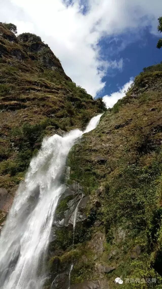在那棵高倨山巔,俯瞰千家寨崇山峻嶺的一號茶樹王的身前,兩條瀑布仿佛應老茶樹王的召喚,為滋養它的族群及鄰居的成長,從天而降。瀑布一路傾灑,滋養叢林萬木的同時,如同一個身披白紗裙的下凡仙子,為叢林舞出一道道或曼妙或壯觀的裊娜舞姿,生動著叢林原本曠寂的天地。那條被稱作“大吊水”的瀑布,是由山腰平闊的叢林間,那條被稱為嘟嚕河的小溪淙淙而來,至山巒中一條天然的石臺小橋上,凌空而降,沖下數百米高的懸崖,落在崖底一片開闊的,除了石塊,仿佛不見泥土的山洼里。晴日里,水流扯著太陽的光芒,在山洼邊沿形成一道彩虹,五彩斑斕,宛若仙境。嘟嚕河,之所以被稱作嘟嚕河,源于河水奔涌中,撞擊在河中凌亂的石塊上,如卡帶的磁盤一樣,奔涌不暢,一路磕磕絆絆,發出嘟嚕嘟嚕的聲音而得名。